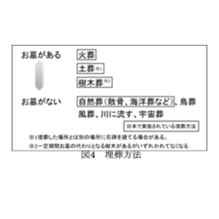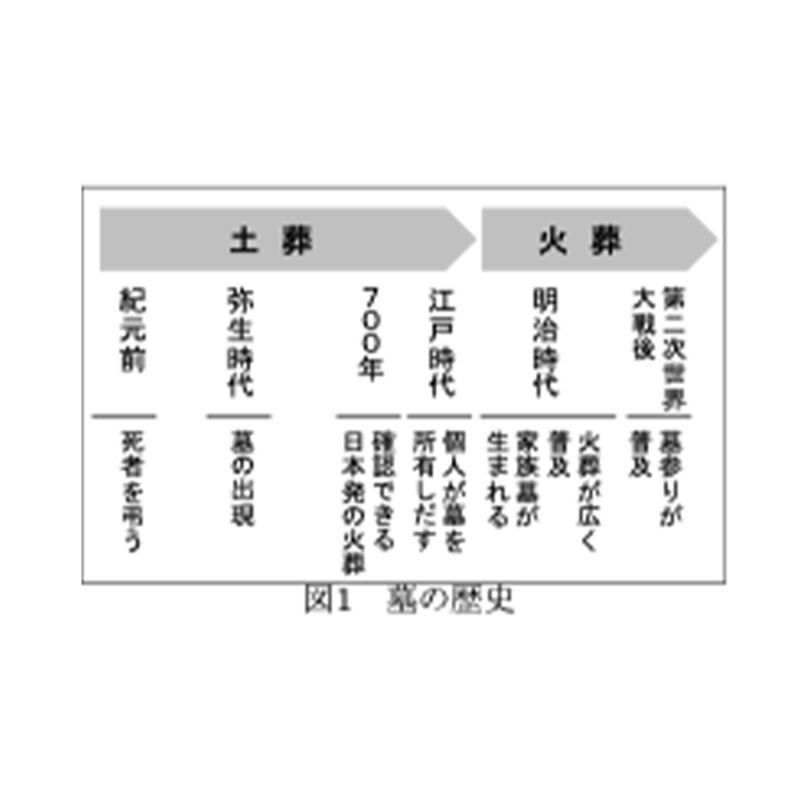 墓地・お墓と歴史の関係お墓の歴史は古く、紀元前にはネアンデルタール人(発掘:フランス南西部)が埋葬された形跡が見つかったことから、死者を祀り供養する習慣があったと考えられる。 縄文時代後期から晩期(4000年~2300年前)には、日本各地で既に集落の中央に墓地と祭礼の広場があり、埋葬が行われていた(図2)。 弥生時代になると、貴重な土地は住居もしくは農地に利用され、山地や乾燥地など住居や農地に適さない土地が埋葬地として選ばれた。この時代には死者をそのまま埋葬するのではなく、甕(かめ)などの土器に納めて埋葬するようになった(図3)。瓶の周りに溝が掘られたものや古墳が形成されたことから、目に見える形で死者を埋葬する「お墓」の誕生はこの時代だと考えられる。 日本で文献記録に残る最古の火葬は飛鳥時代に僧の道(どう)昭(しょう)が遺言によって火葬された事例(『続日本記(しょくにほんぎ)』より)であるが、それ以前にも火葬が行われた形跡が存在しているため、火葬の起源は明らかとなっていない。 江戸時代初期になると、貴族階級や武士の間で個人が墓を所有し始めるが、実際に埋葬された場所とは別の場所に「祀り墓(まつりぼ)」を設ける(両墓性)が一般的であった。江戸時代中期には檀家制度 が確立し、庶民の生活の中に供養や葬儀、墓などが定着し始めた。江戸時代後期には戦いが減り、経済が発展すると共に庶民がお墓を持つようになっていった。 明治時代末期に制定された「墓地及埋葬取締規則(1884年)」によって火葬の普及が進み、1つの墓に何人も埋葬する、家族墓が生まれた。第二次世界大戦後には墓参りが普及し墓が先祖を供養する場として認識されるようになった。 高度成長期以降、都市への移住が加速し、お墓が遠方にあるなどの理由から、お墓の管理が困難になり、居住地の近くに新たに墓を購入するなど墓を継承しない傾向が生まれ、先祖代々の墓という考えから、一代限りの個人墓に考えが回帰する傾向にあるのではないかと考える。 また、背景でも述べたようにお墓を作らないケースも増加しておりこの場合は将来的にお墓の管理をする必要がなくなることが最大のメリットであると考える。「家族」より「個人」が優先される傾向にある現代において、個人がお墓や埋葬方法を選択できることは重要なポイントである。
